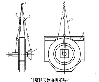 如下球磨機同步電機吊裝圖所示。以行車吊起球磨機同步電機平穩地落在兩個轉子軸瓦上,并安上軸承上蓋。