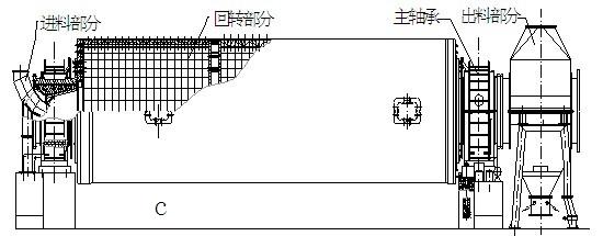 如上圖c中所示是中心傳動的球磨機。出料端蓋與帶有出料孔的傳動接管相聯接。出料端部設有格子板、揚料板和出料螺旋。螺旋線的方向與磨機的轉向相同,在傳動接管上裝有一個圓筒篩。篩內裝有振打裝置,防止篩孔堵塞。這些裝置都被密封在出料罩內。出料罩上部用管路通向收塵器,下部通過成品輸送設備將物料運走。傳動接管的另一端從出料罩伸出來通過齒形聯軸節與減速機出來的低速軸相連接。在傳動系統中還設有慢速驅動裝置,以備檢修時可用它將筒體上的人孔門隨時轉到所需要的位置,以及在啟動磨機時應用。
