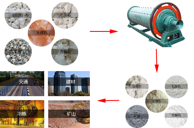 開采的礦石先由顎式破碎機進行初步破碎,在破碎至合理細度后經由提升機、給礦機均勻送入球磨機,由球磨機對礦石進行粉碎、研磨。經過球磨機研磨的礦石細料進入下一道工序:分級。螺旋分級機借助固體顆粒的比重不同而在液體中沉淀的速度不同的原理,對礦石混合物進行洗凈和分級。經過洗凈和分級的礦物混合料在經過磁選機時,由于各種礦物的比磁化系數不同,經由磁力和機械力將混合料中的磁性物質分離開來。 經過磁選機初步分離后的礦物顆粒在被送入浮選機,根據不同的礦物特性加入不同的藥物,使得 所要的礦物質與其他物質分離開。在所要的礦物質被分離出來后,因其含有大量水分,須經濃縮機的初步濃縮,再經烘干機烘干,即可得到干燥的礦物.
