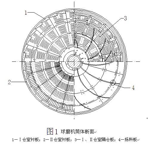 球磨機筒體是用鋼板卷制焊接而成的圓筒形薄壁殼體,磨機筒體內裝設有不同形狀的襯板和隔倉板,在球磨機筒體本身還開有人孔,以便檢修和裝填研磨體。磨機筒體是一種承受交變動載荷并處于低速而長期運轉的構件,而且又是磨機的主體。因此在設計中必須考慮它是不是更換零件,即要保證工作中安全可靠,長期使用。在制造中的關鍵就是保證筒體的圓度和焊接質量。(球磨機筒體斷面如下圖1)