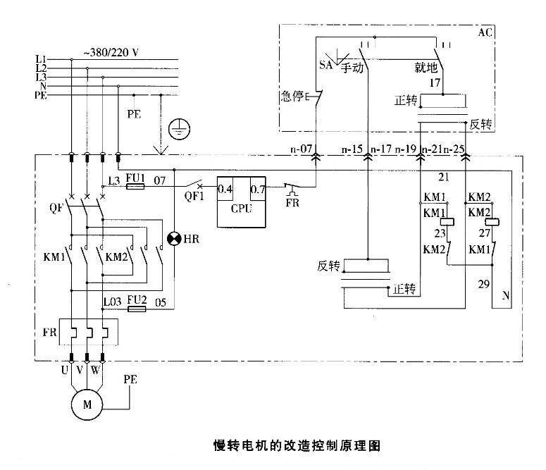 球磨機慢轉電機由單向轉動改為雙向轉動,實現電機正反轉。當離合器工作面被卡死的時候,我們可以讓電機進行反轉,調節爪子之間的間隙;當離合器非工作面卡死的時候,我們可以讓電機進行正轉,調節聯軸器直齒輪的間隙,實現伸縮器的自由分離。同時實現電機正反轉,為檢修帶來方便。