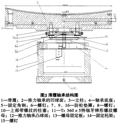 6、每個支座4個滑履軸承的結構,方便我們檢修和更換滑履軸承,哪一個滑履軸承壞了,需要更換,將下圖中特細牙螺紋螺母(11)擰松,將它總高度下降,即可抽出,不必像主軸承或雙滑履支承那樣,將球磨機筒體抬起才能更換。因為抬起球磨機筒體就要將前面與進料裝置,后面與主減速機的聯接都要拆卸,檢修完畢又要重新找正,再恢復這些聯接,工作量很大,需要時間長。