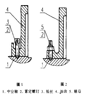 不少的企業(yè)也采取力所能及的放松措施,如緊定螺釘頭部鉆Φ3-5mm的小孔,擰緊緊定螺釘后用適當(dāng)?shù)你U絲環(huán)繞中空軸將三個(gè)緊定螺釘穿在一起,但是,由于受安裝位置限制,穿鉛絲相當(dāng)困難,且由于油盤(pán)上的緊定螺孔離油盤(pán)盤(pán)體較進(jìn),安裝的時(shí)配鉆中空軸上的止退孔相當(dāng)不易(一般要特質(zhì)的長(zhǎng)柄鉆方能解決問(wèn)題)。