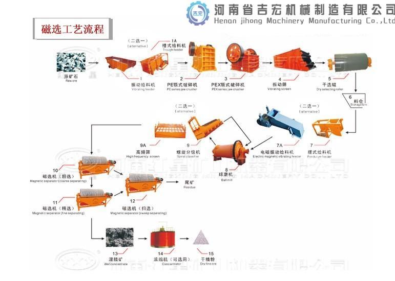 磁選選礦生產(chǎn)線為(料倉) ---- 給料機(jī) ---- 顎式破碎機(jī)(粗) ----顎式細(xì)碎機(jī)(細(xì))----球磨機(jī)----螺旋分級(jí)機(jī)----磁選機(jī)(可得到精粉)。其中間的機(jī)器之間可用輸送機(jī)相接。