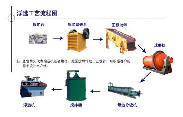 浮選選礦設備有:給料機、破碎機、振動篩、球磨機、分級機、攪拌桶、浮選機、烘干機等